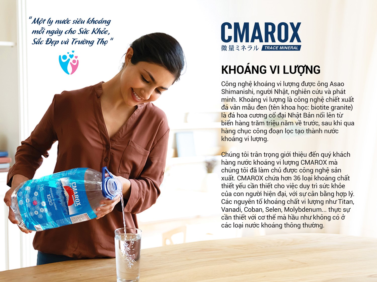 CMAROX chứa hơn 36 loại khoáng chất thiết yếu cần thiết cho việc duy trì sức khỏe của con người hiện đại, với sự cần bằng hợp lý, Các nguyên tố khoáng chất vi lượng như Titan Vanadi, Coban, Selen, Molybdenum… thực sự cần thiết với cơ thế mà hầu như không có ở các loại nước khoáng thông thường.